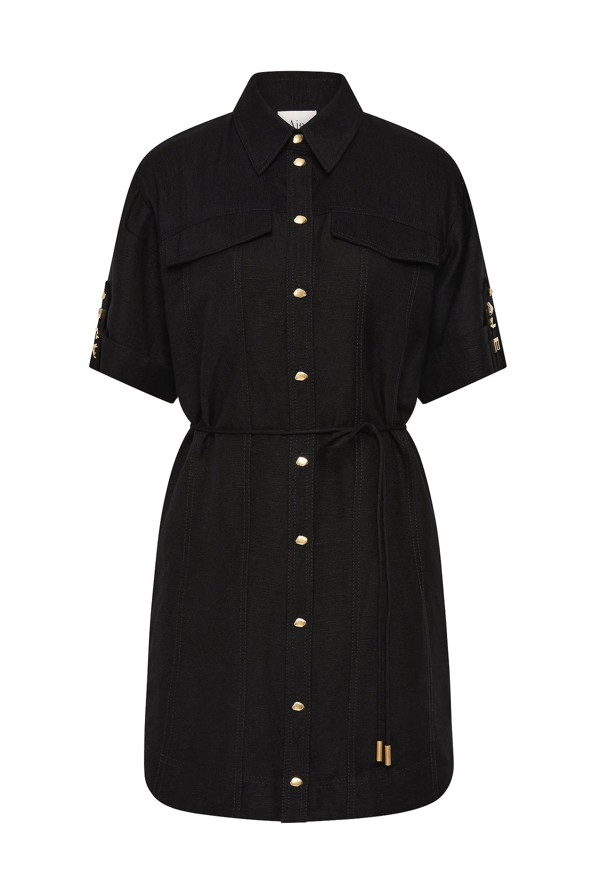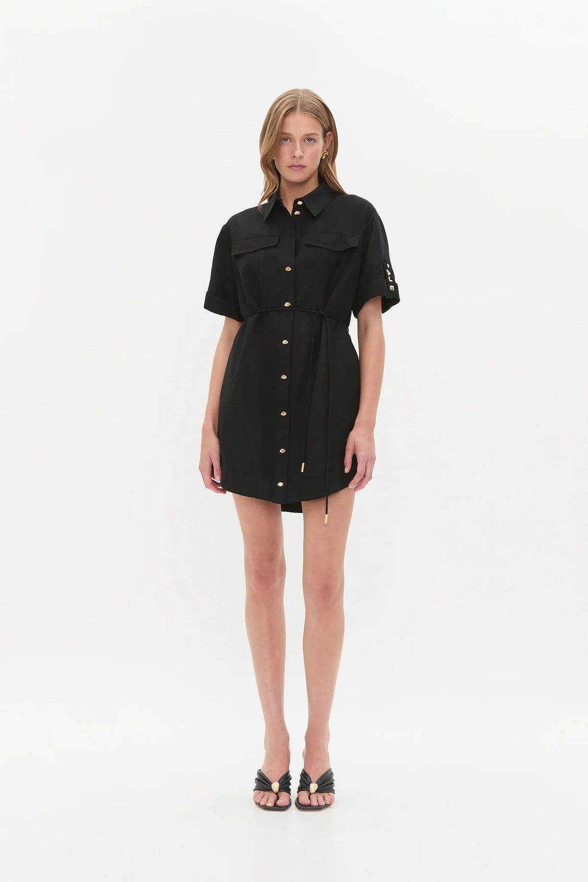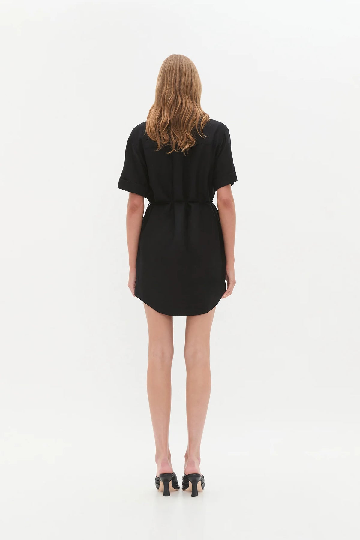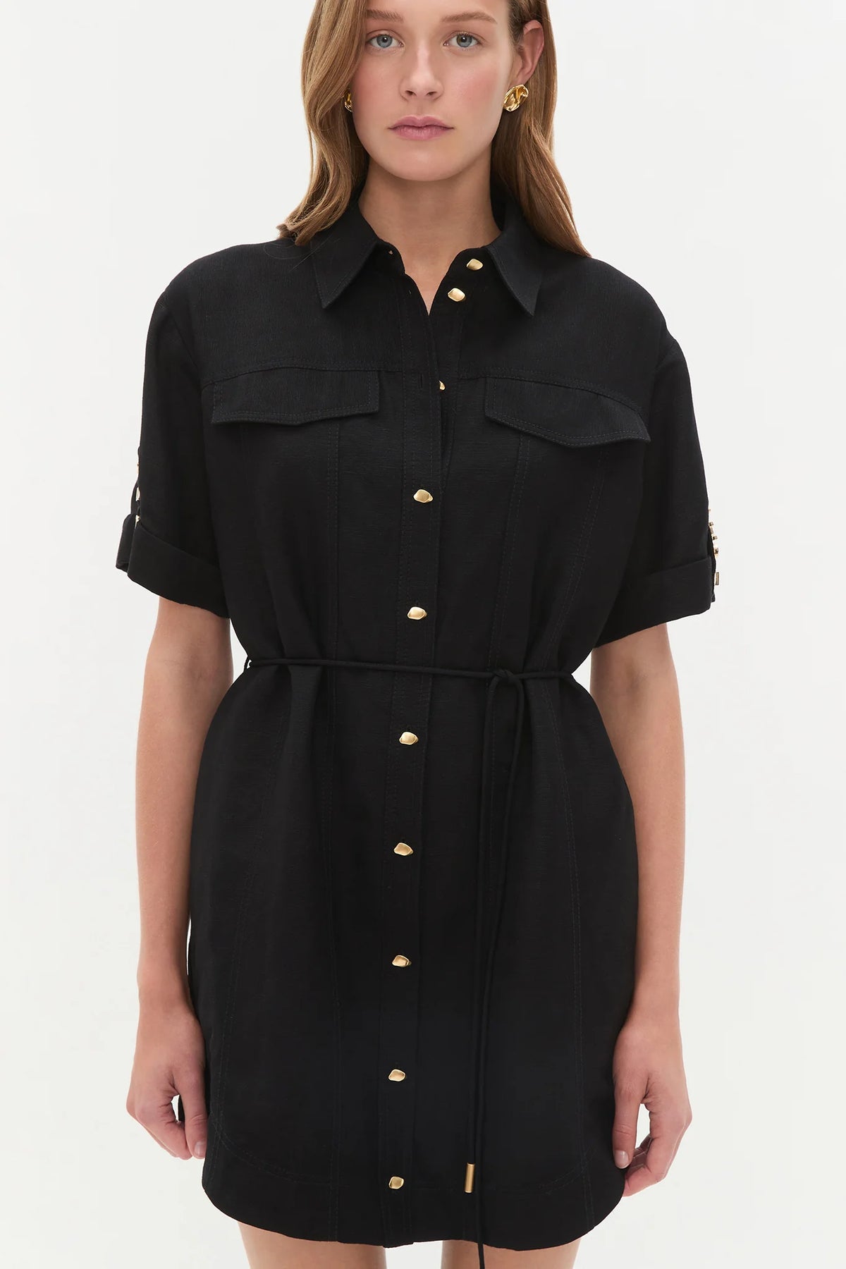 A timeless and effortless mini dress designed for everyday wear. Featuring a classic shirt collar with a statement button detail and a front button placket for easy styling. The short sleeves offer a relaxed silhouette, while the removable rouleau belt with tie ends allows you to cinch the waist for a flattering fit. Finished with practical side seam pockets, this versatile dress transitions seamlessly from day to night.