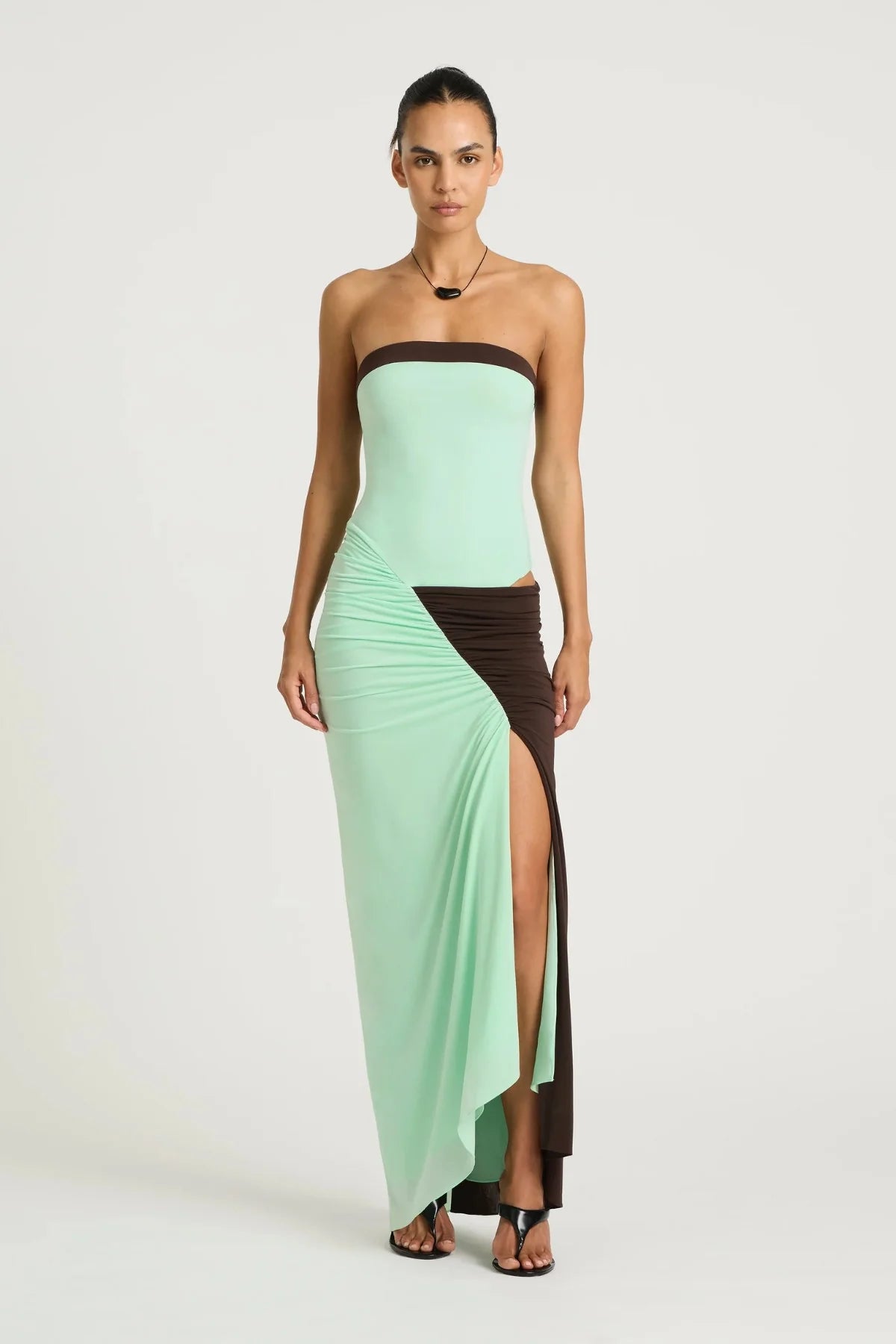 The Rumi Maxi Dress is designed to contour the body with a high-stretch jersey fabrication that offers both comfort and a sculpted fit. It features a strapless asymmetric neckline and a distinctive curved, gathered skirt with a front leg opening that allows for effortless movement. The high-cut bodysuit includes a snap crotch closure and a detachable lining, giving you the option to wear it sheer or solid. The adjustable skirt can be styled above or below the hip to reveal a subtle cut-out. Finished in a maxi length with an asymmetric cascading hem split, the dress measures 129cm from the front neckline to the hem. The model wears a size 8.